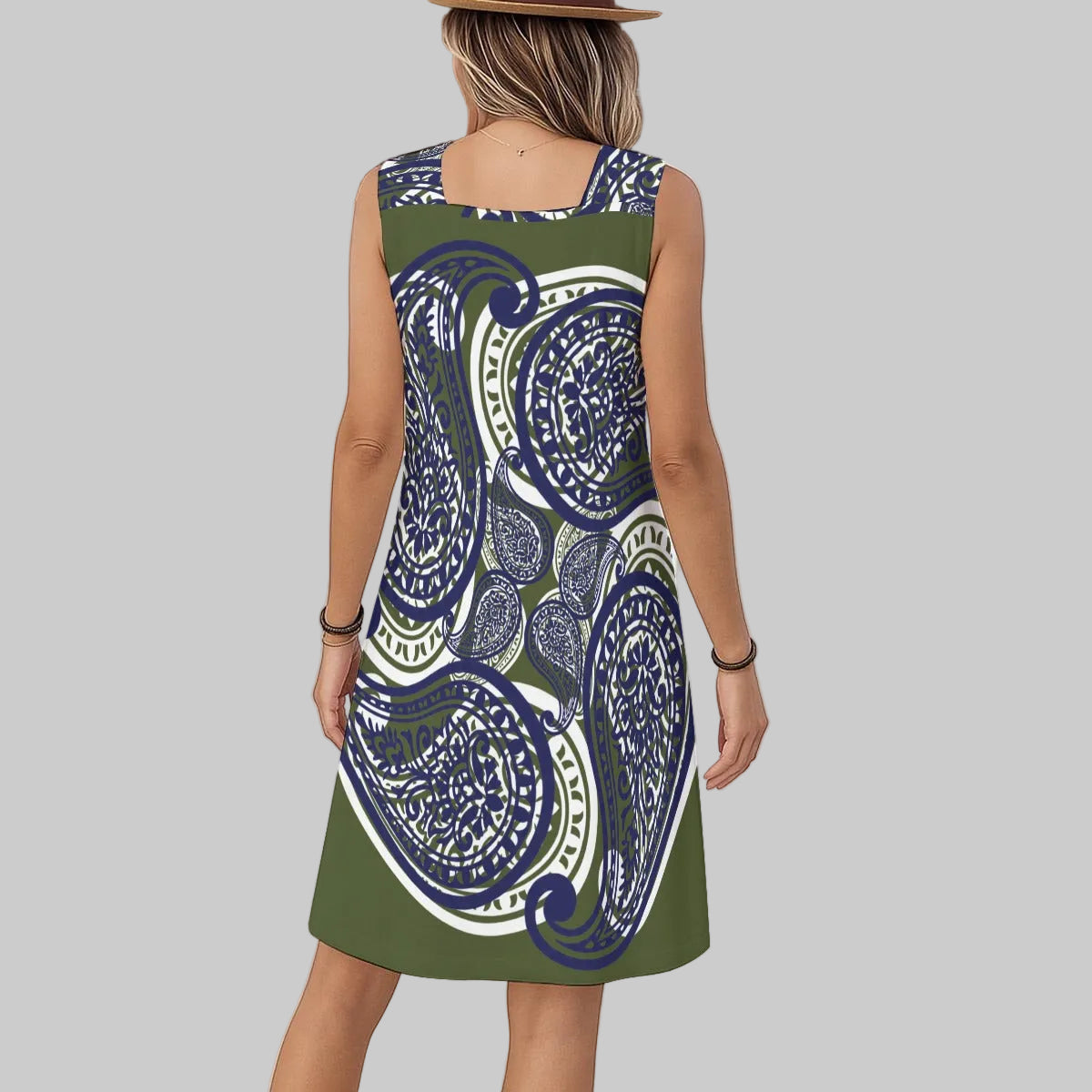 Turn heads in this Army Green Paisley Mofiff Sleeveless Summer Dress—a bold mix of eye-catching bandana prints and sleek style. The sleeveless design shows off your shoulders with ease, making a statement wherever you are. Made from a durable polyester-spandex blend, it moves with you and handles anything the day brings. Whether for big meetings or nights out, this dress is made to stand out. It’s vibrant, tough, and impossible to ignore. You'll feel super cofindent and beautiful stepping out in this dress.