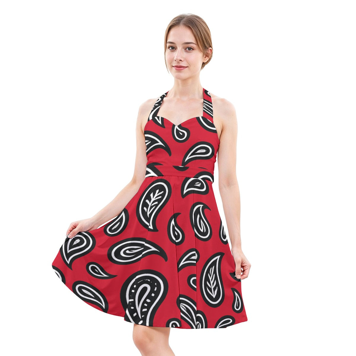Own the room in this Women's Red Halter Skater Dress—a bold bandana print stunner that's both comfy and eye-catching. The halter design crosses just right, while the polyester-spandex blend stretches with you through reaching, bending, and all-day wear. Whether you're heading to a meeting or a night out, the skater dress keeps going...just like you! And its vibrant colors stay true wash after wash. Sleeveless and ready to go, it's the kind of piece that becomes an instant favorite.