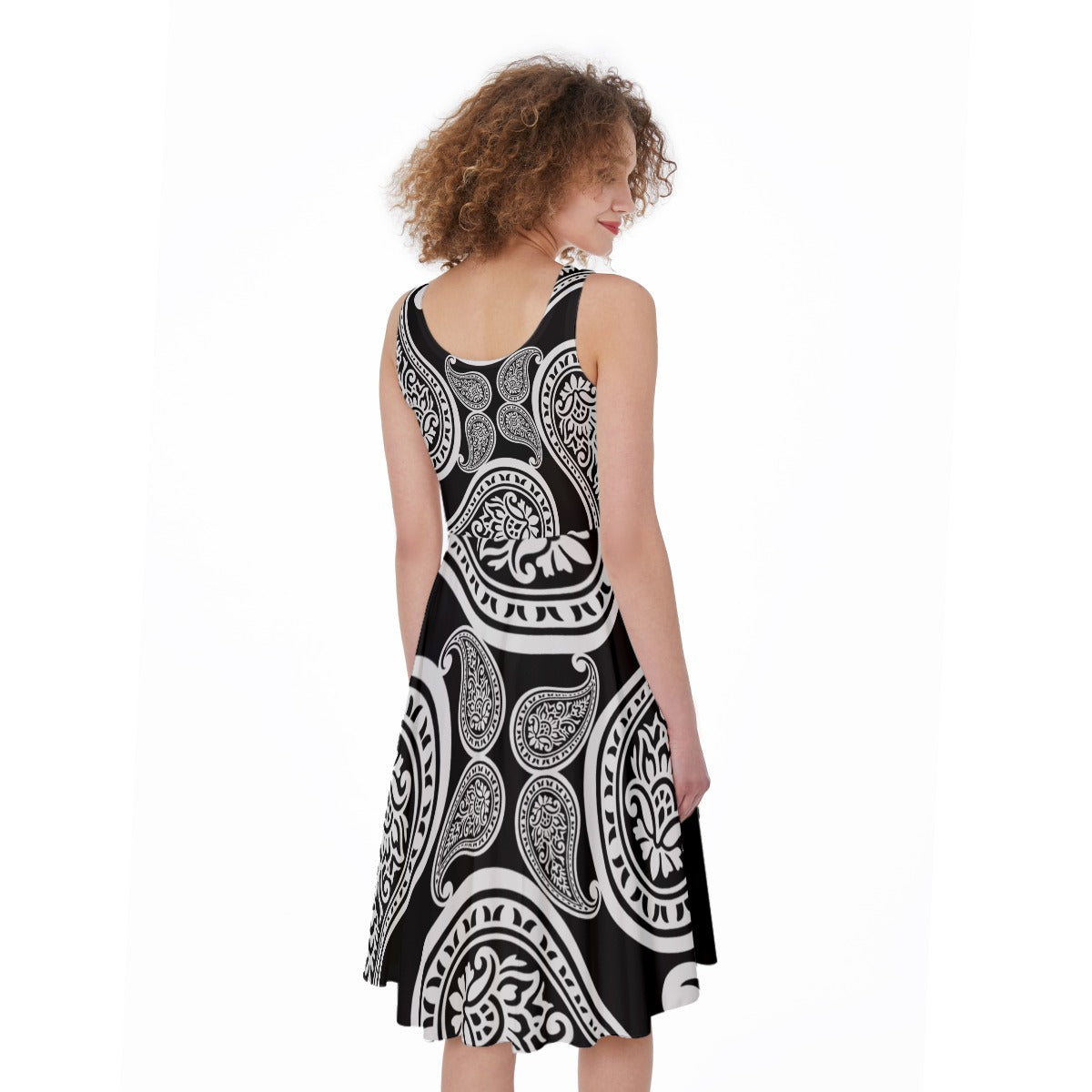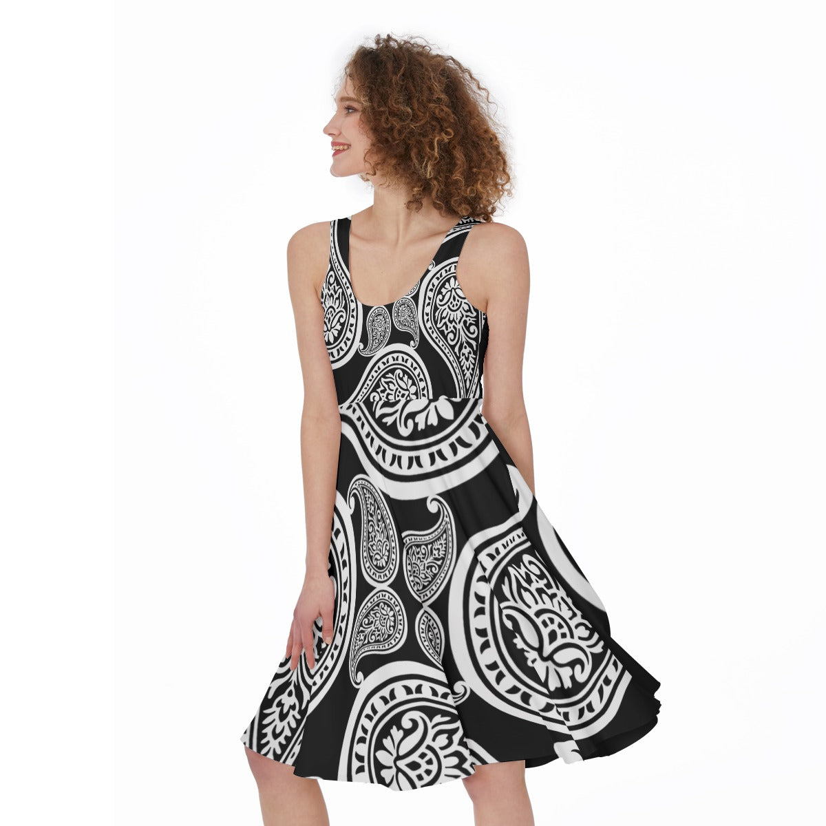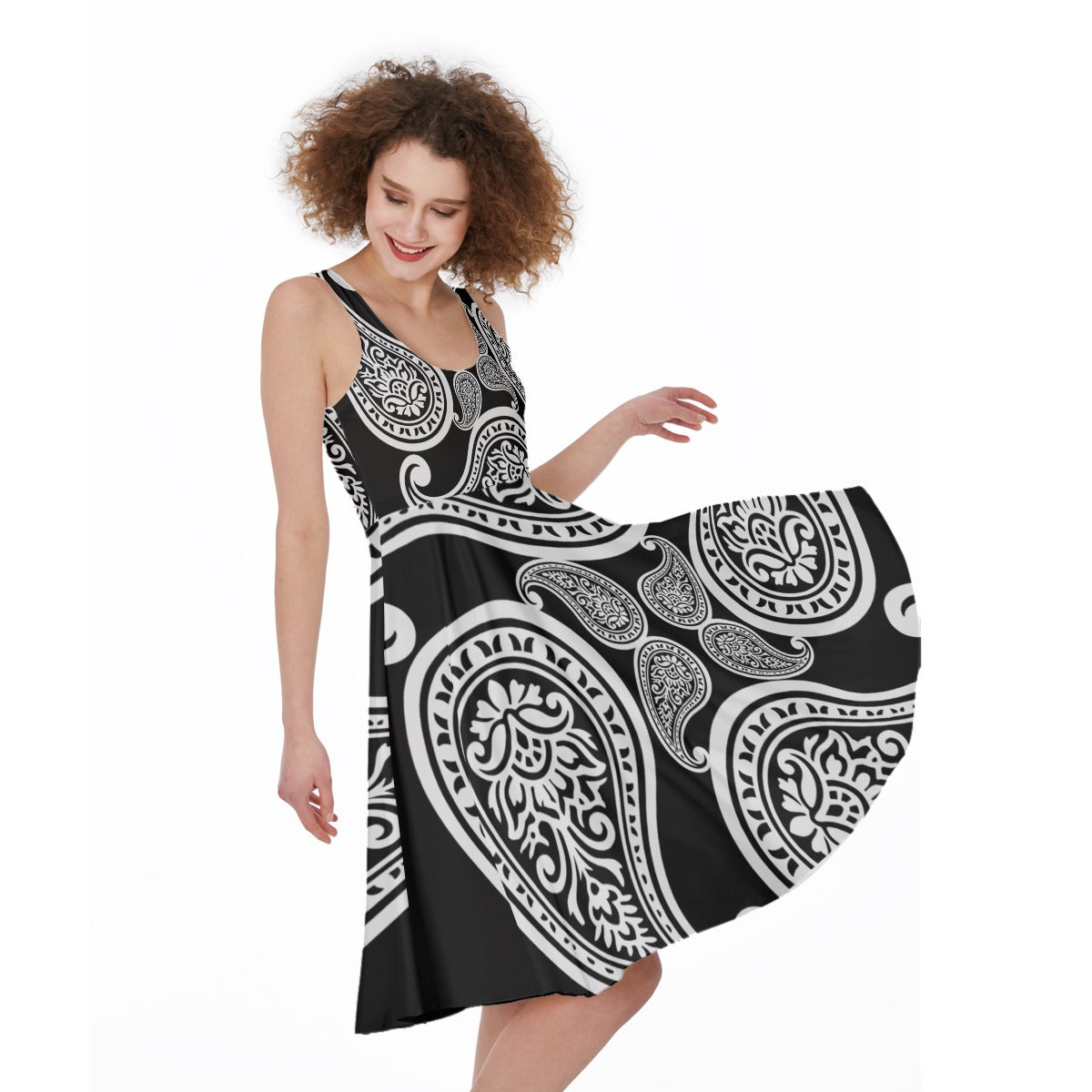 tep into the spotlight with this Black and White Paisley Sleeveless Dress—where bold pattern meets unbridled confidence. The striking bandana-inspired design pairs perfectly with a sleek, armless silhouette that lets your style do the talking. Practical the flexible polyester-spandex blend moves with you through every adventure. Whether you're crushing it at work, grabbing coffee with friends, or dancing into the evening, this dress delivers the perfect blend of eye-catching flair and real-world wearability. Breathable, built to last, and unapologetically you.