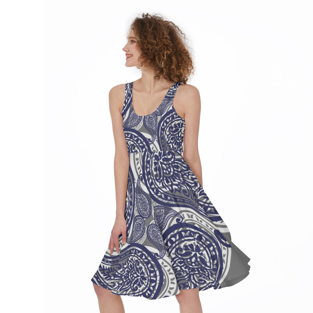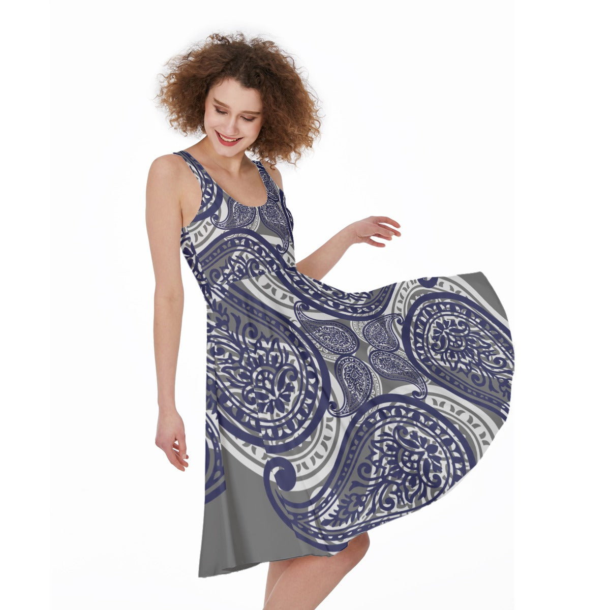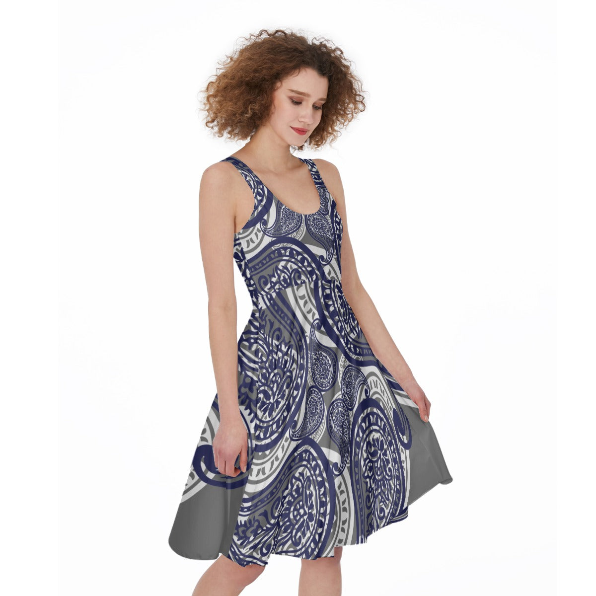 Step into the spotlight with this Grey Paisley Sleeveless Dress, where eye-catching bandana patterns meet everyday wearability. The sleeveless cut exudes effortless confidence! Crafted from a stretchy polyester-spandex blend, it's breathable enough for all-day wear and tough enough to handle whatever you throw at it. Whether you're crushing meetings, grabbing coffee, or dancing till dawn, this dress delivers the perfect blend of bold style and practical comfort. Wear it for you, and let everyone else catch up.